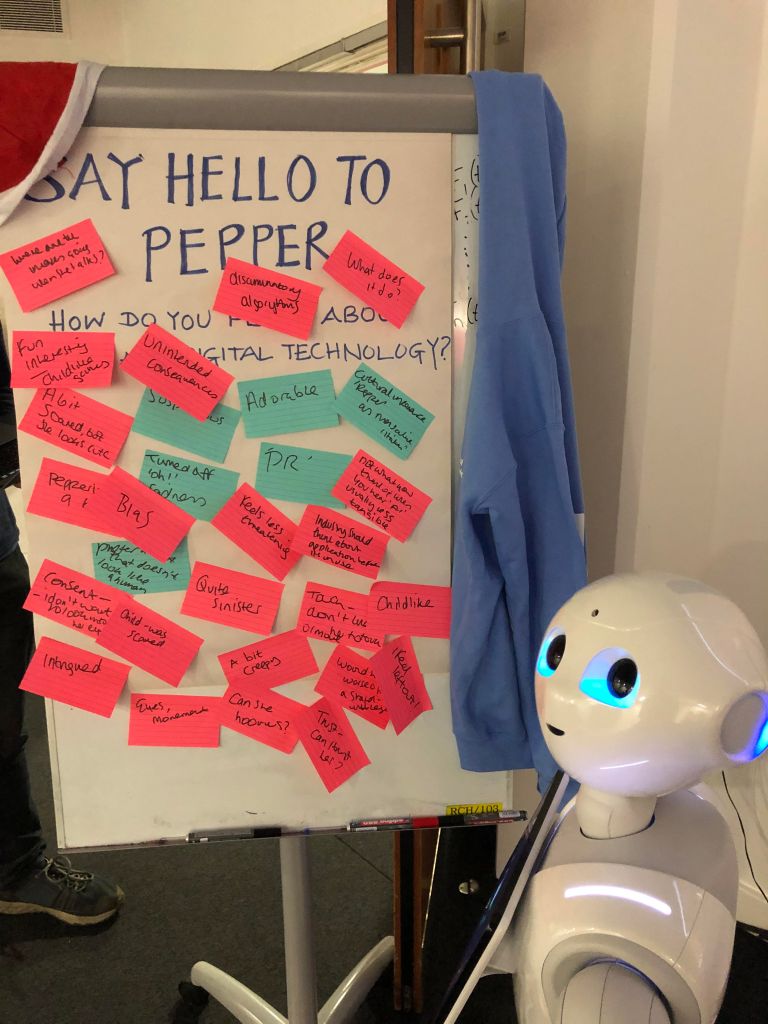Who doesn’t have a view on robots? We held an open house event just before Christmas for academics and industry to hear about some of our research projects and to celebrate Christmas and the New Year. As part of this and to promote the project I am working on, I set up a corner of the room to gather views on Pepper as an example of an (albeit narrow) AI. Unsurprisingly, most people had something to say about Pepper…