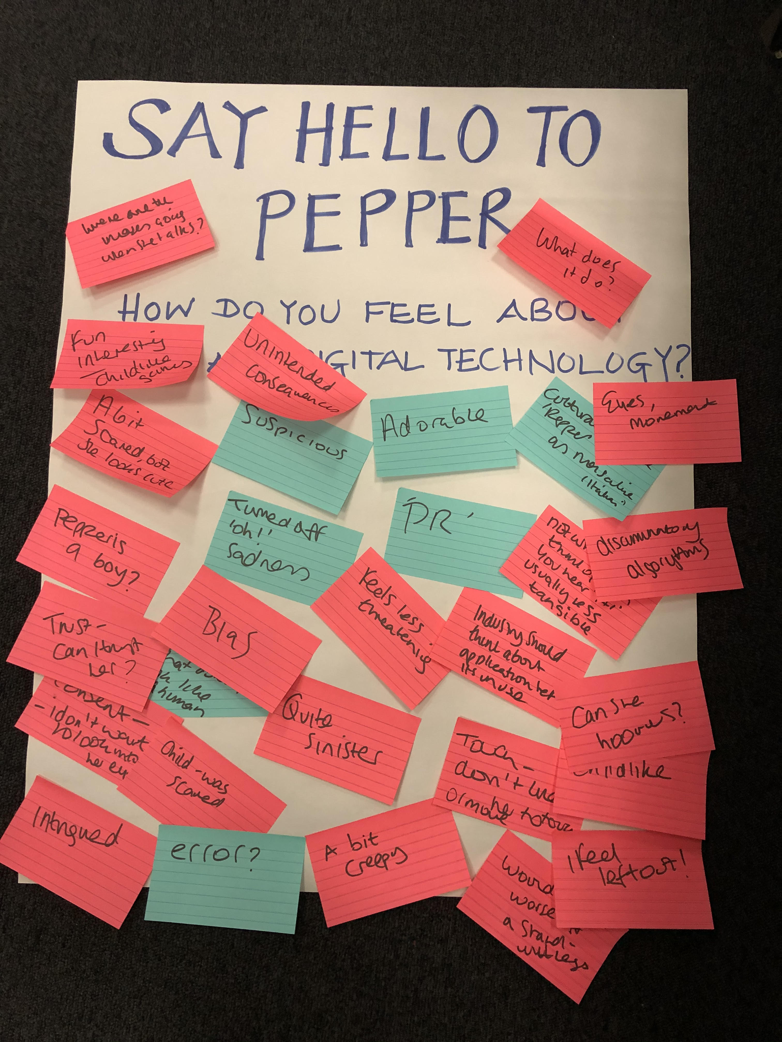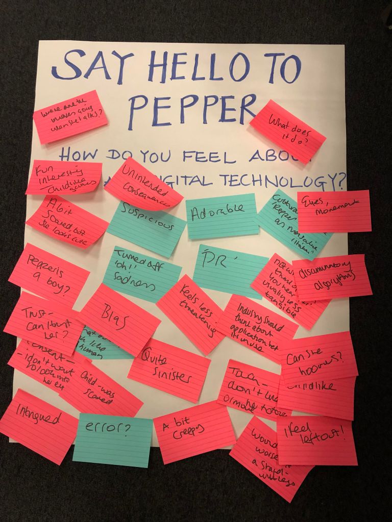 Emotions – people expressed fear, excitement, sadness, intrigue, frustration, isolation, attachment, suspicion. Children did not warm to Pepper. Words like ‘creepy’ and ‘cute’ were used in equal measure!